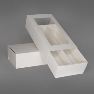 Esken består av lokk + bunn + hylse, med vindu på én side.